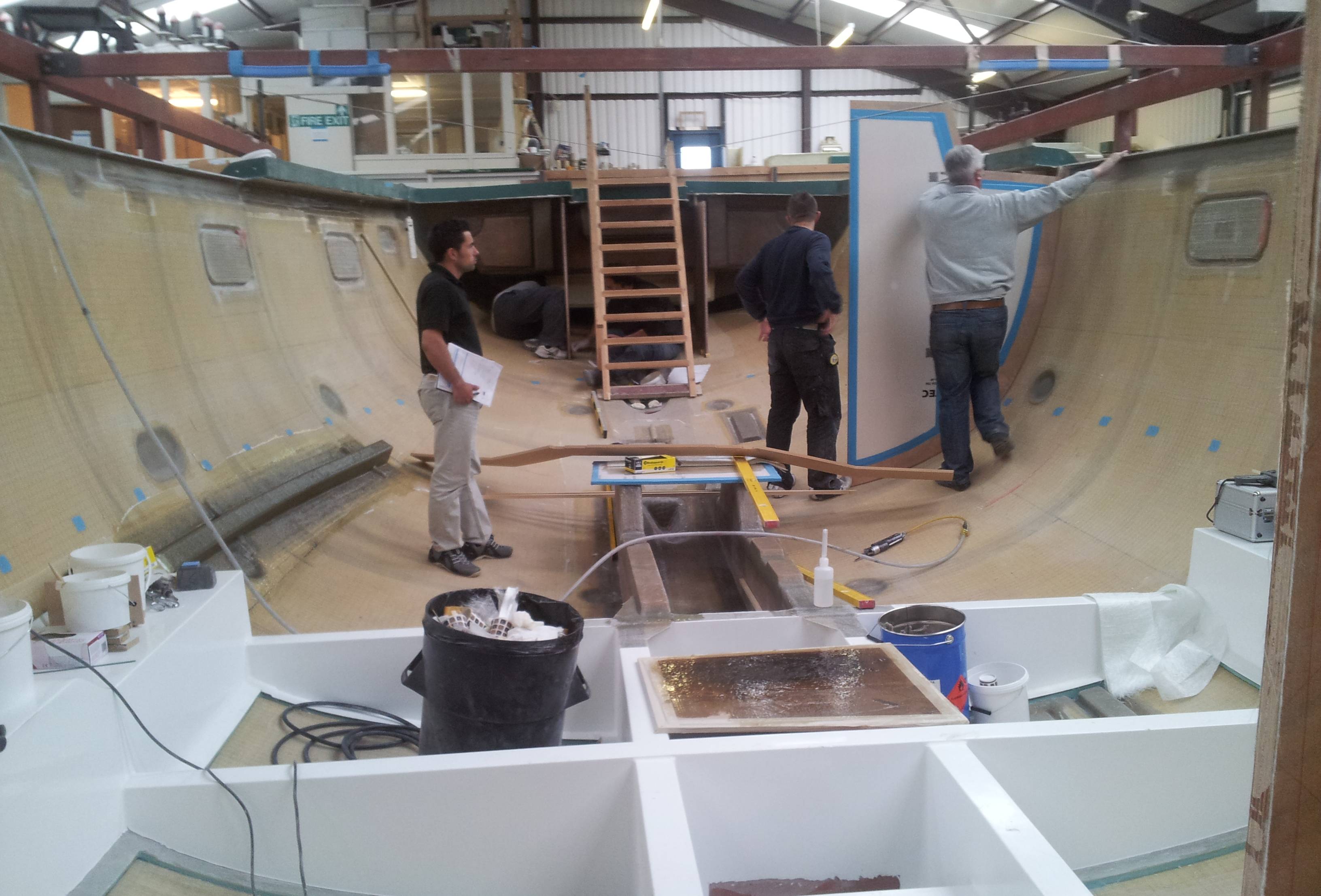 Der Rumpf ist nun fertig laminiert, jedoch noch in der Form. Bevor entformt werden kann, werden die Schotten gesetzt. Einige sind schon drin.