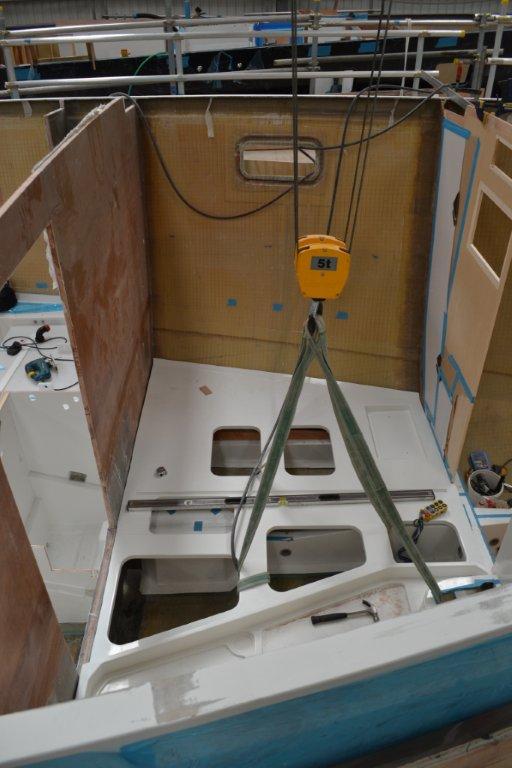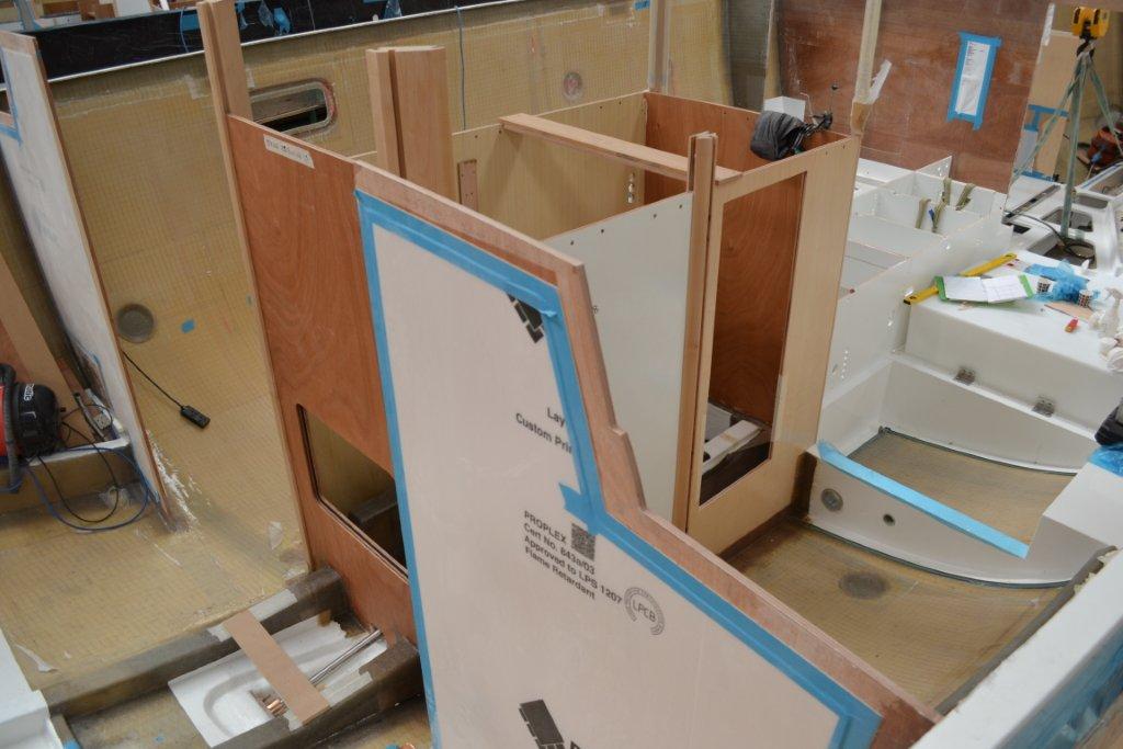Und weiter geht es mit dem Ausbau. Erkennbar wird jetzt schon der Maschinenraum mit eingebauter Welle. Außerdem sind beidseitig die Treibstoff- und Wassertanks mittschiffs eingebaut. Im Vorschiff wird ist die Bodengruppe für die Backbord-Kabine und Vorschiff-Bad gesetzt.