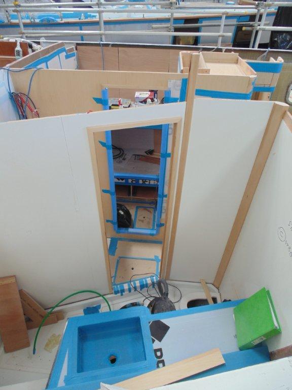 Britischer Geschmack harmonisiert nicht immer mit den Vorstellungen von Liebhabern gerader Linien. Die Standard-Waschbecken der D57 sind oval. Nun, das ist nicht Jedermanns Sache … und unsere erst recht nicht. Wie auf dem ersten Bild hier zu sehen ist haben wir diese Waschbecken durch rechteckige ersetzen lassen. Diese wurde eigens aus Deutschland importiert. Die Fräsprogramme für die Corian-Oberflächen wurden verändert, um eine nahtlose Einpassung zu erreichen. Jetzt sind selbst die Jungs von Discovery begeistert. Wenn dann noch der Wasserhahn, den wir von Hanse erworben haben, dazu installiert ist, wird das super cool aussehen. Im Übrigen ist hier das Kinderbad (oder vordere Bad) zu sehen. Im Hintergrund geht es zur Backbord-Kabine mit Stockbetten … das zukünftige Zuhause für Vsevolod (oben) und Arvid (unten).