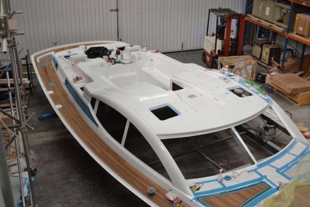 Weiterhin geht es mit dem Deck weiter. Das Teak scheint jetzt weitgehend verlegt zu sein. Es fehlt noch auf den Sitzflächen und Seitenteilen. Vermutlich ist das Setzen des Decks nicht mehr weit.