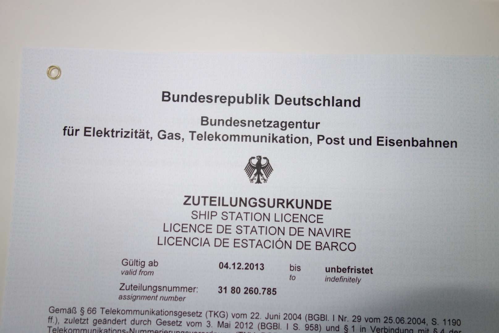 Heute kam Post von der Bundesnetzagentur mit unserer Zuteilungsurkunde. Jetzt hat unser Schiff bereits ein offizielles Rufzeichen und eine MMSI bekommen. Wenn wir uns also zukünftig auf offener See treffen, dann könnt ihr uns unter DJ6449 rufen oder per DSC mit 211628230 anfunken. Jetzt steht noch die Frage aus, ob wir das Rufzeichen auch auf die Segel drucken lassen.