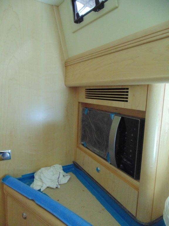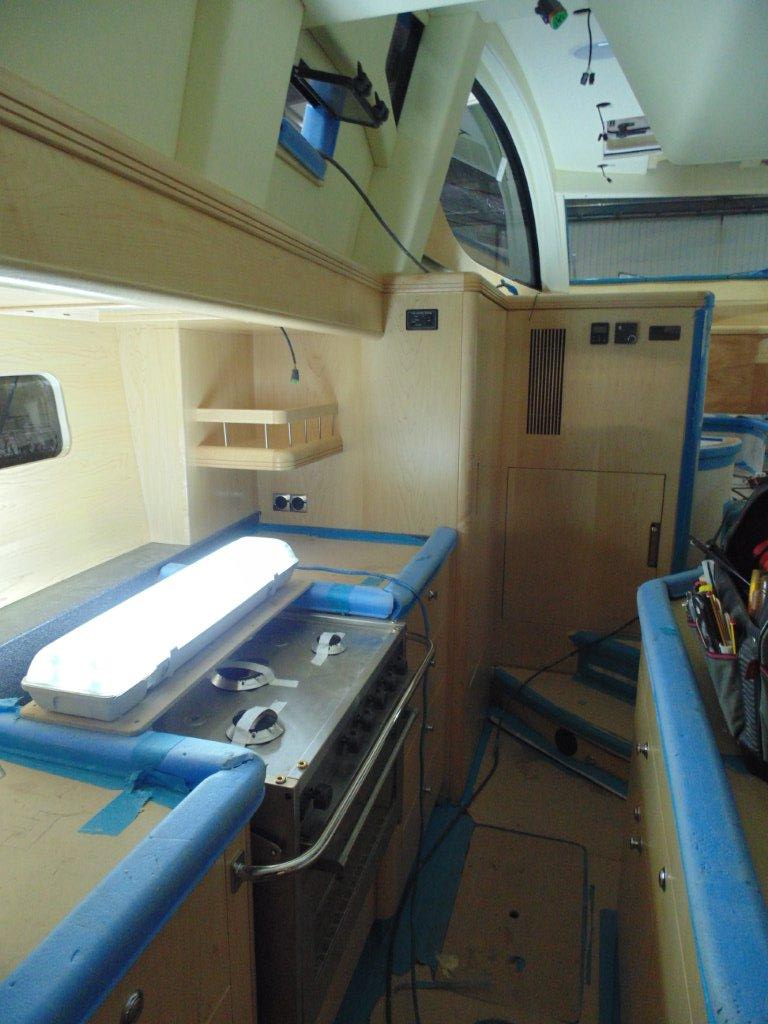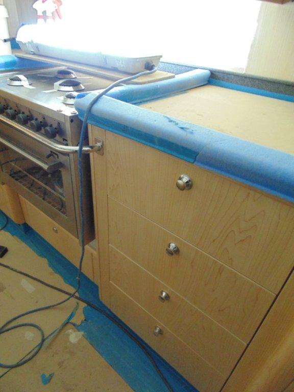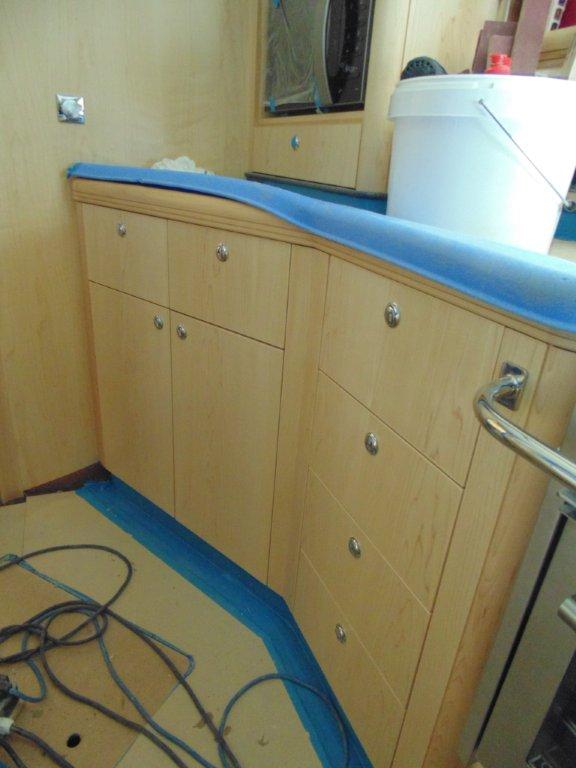 Die Möbel der Pantry wurden jetzt vom Schutz befreit. Jetzt könnt ihr sehen, wie unsere Bordküche aussehen wird …