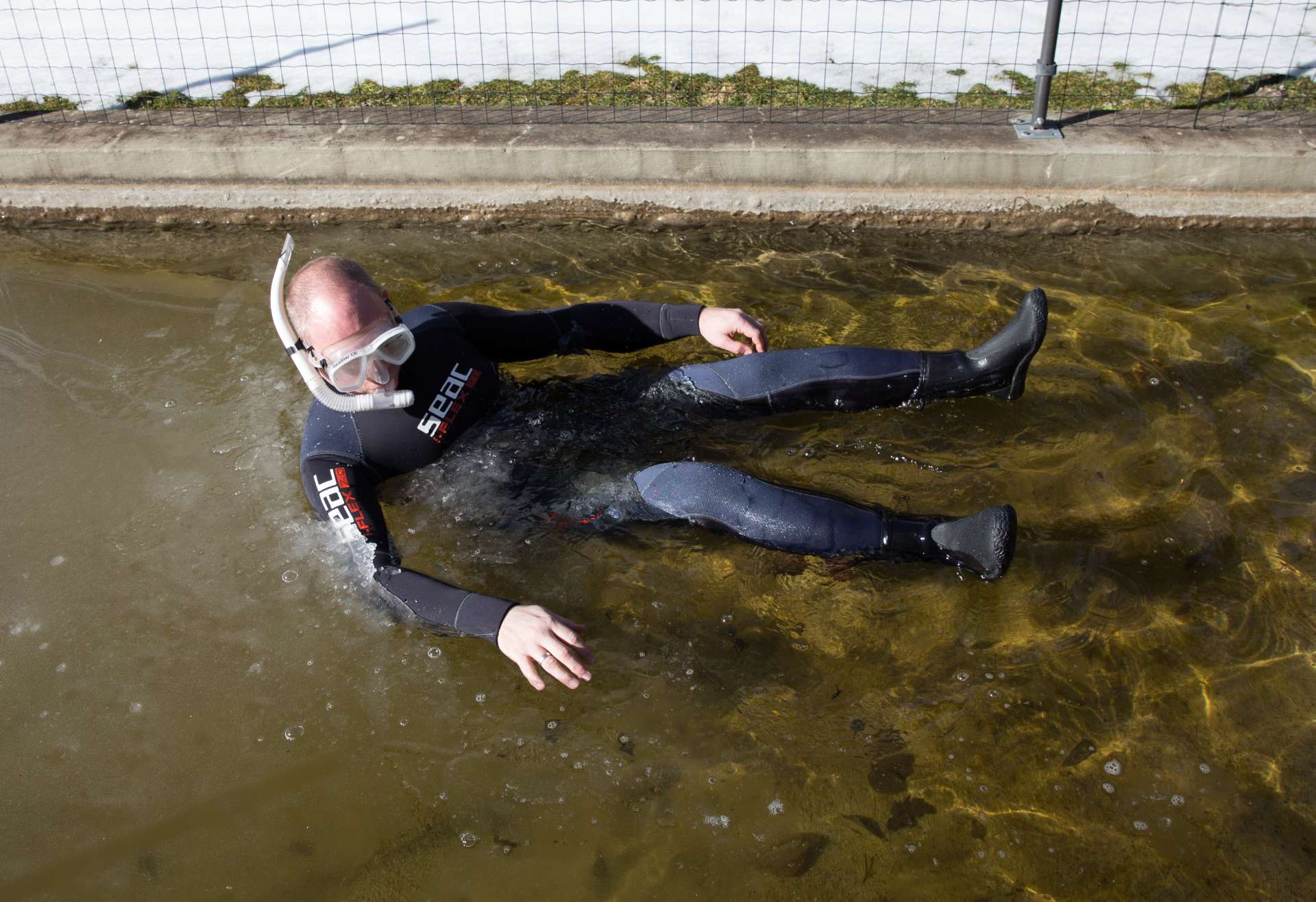 Derzeit verwenden wir den Hauptteil unserer Zeit dafür, Ausrüstung für unsere Reise auszusuchen, zu bestellen und zu testen. Praktisch ist es da, dass der Fischteich in unserem Garten noch teilweise zugefroren ist. So konnten wir zum Beispiel den Taucheranzug unter realistischen Bedingungen testen. Leider fehlten noch Haube, Handschuhe und insbesondere der Bleigürtel. So schwimmt Thomas wie ein Korken auf der Wasseroberfläche.