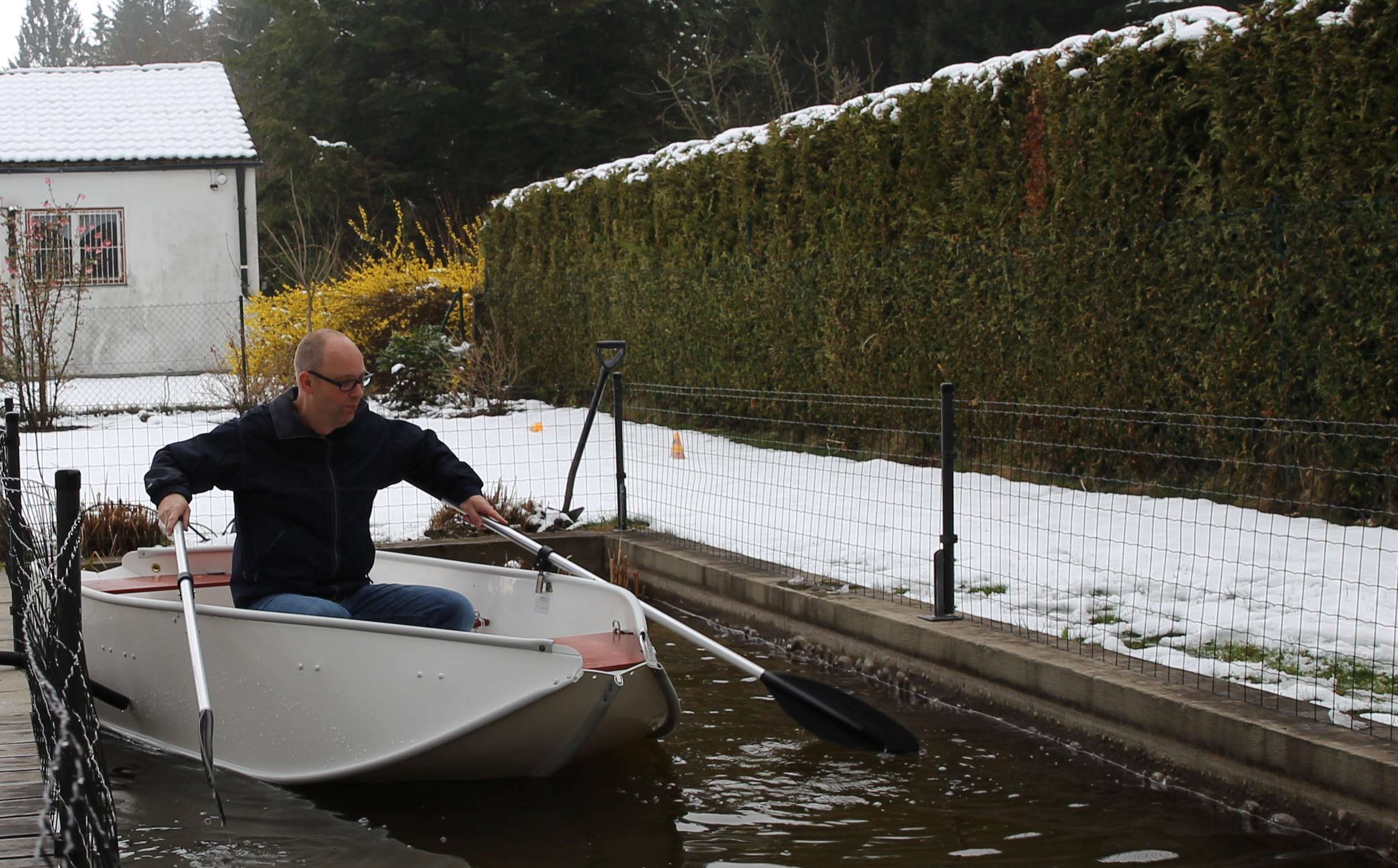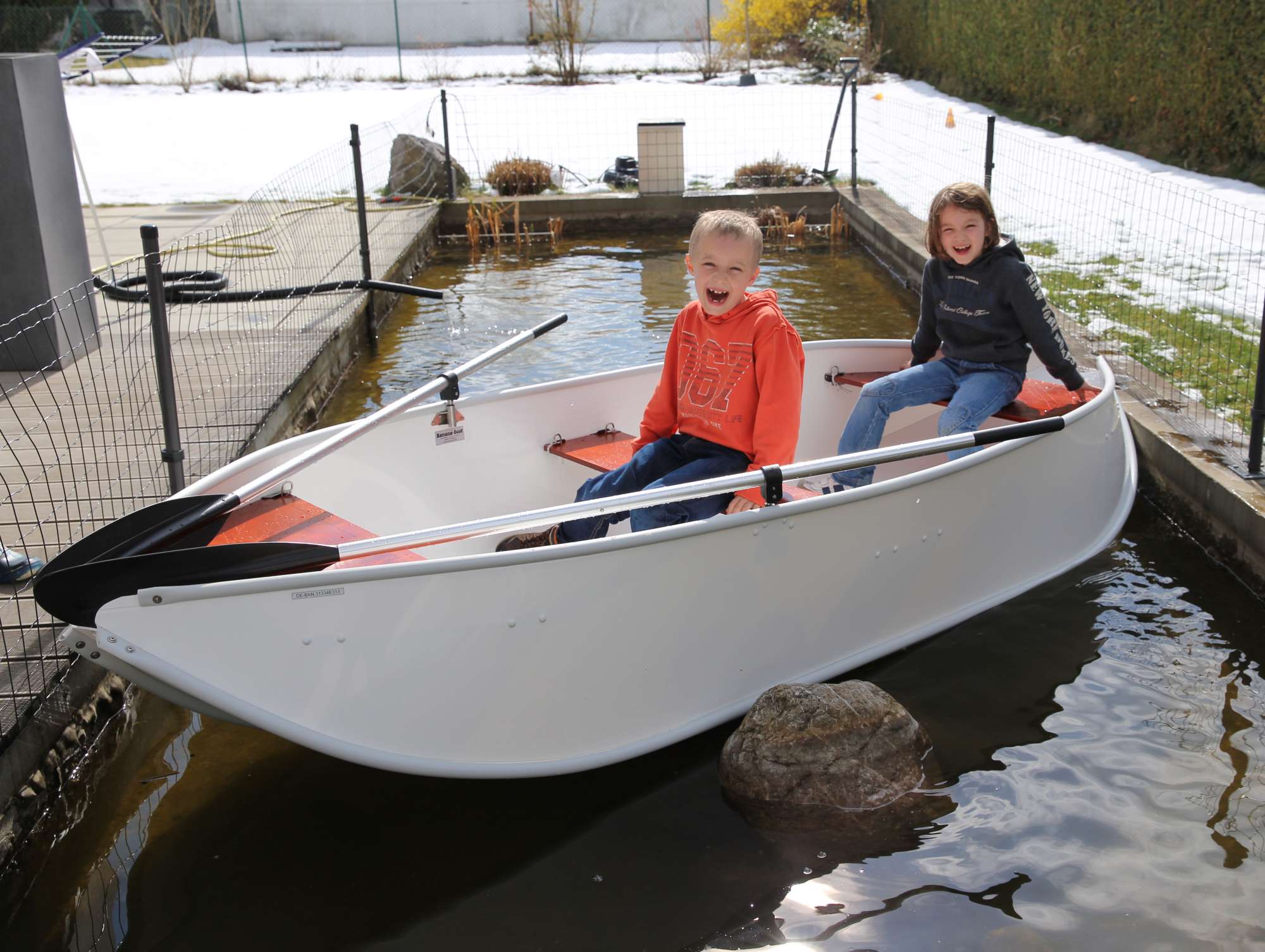 Dann ging es ab in den Gartenteich, um auch die Schwimmeigenschaften zu testen. Dass man darin nicht rudern kann, war klar. Den Kindern hat es trotzdem großen Spaß gemacht. Und die Vorfreude ist jetzt natürlich umso größer, das Boot auch demnächst im großen Teich auszuprobieren.