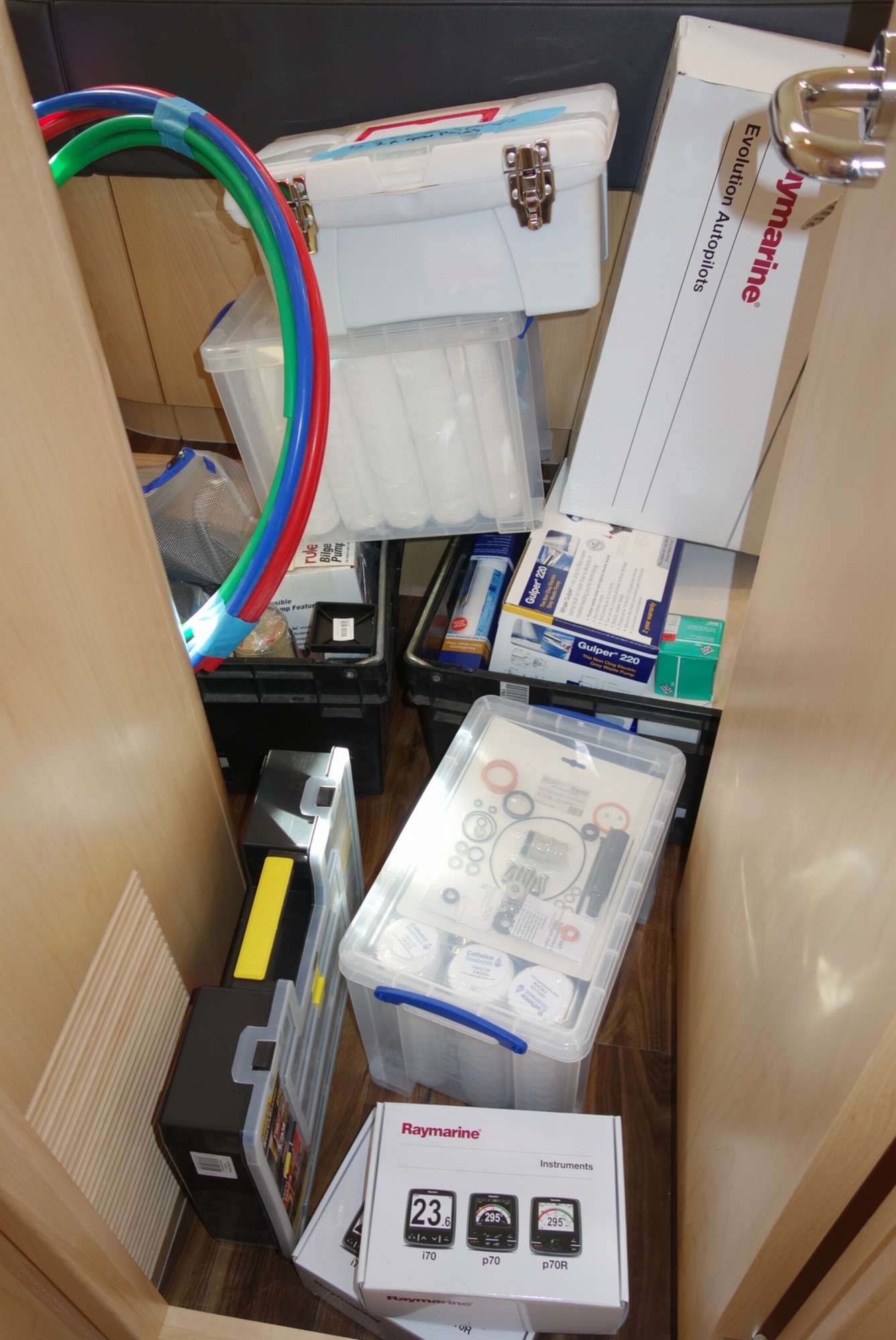 Das Ganze will aber erst mal verstaut sein … an Bord nicht immer einfach. Alles was man hier im Bild sieht, musste seinen Platz finden und detailliert mit Lagerort, Menge und Teilenummer erfasst werden: