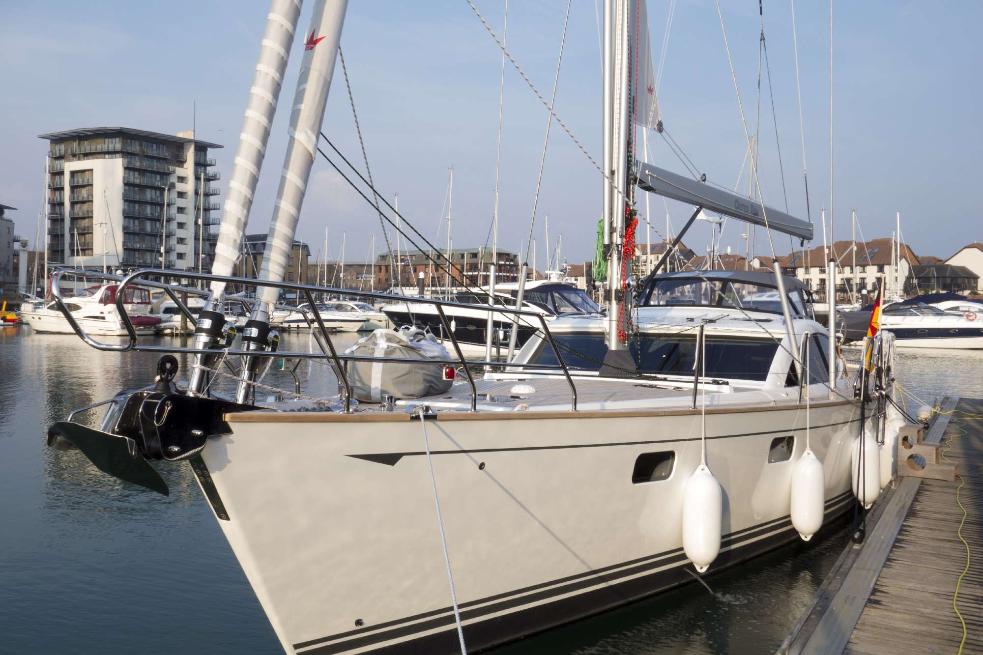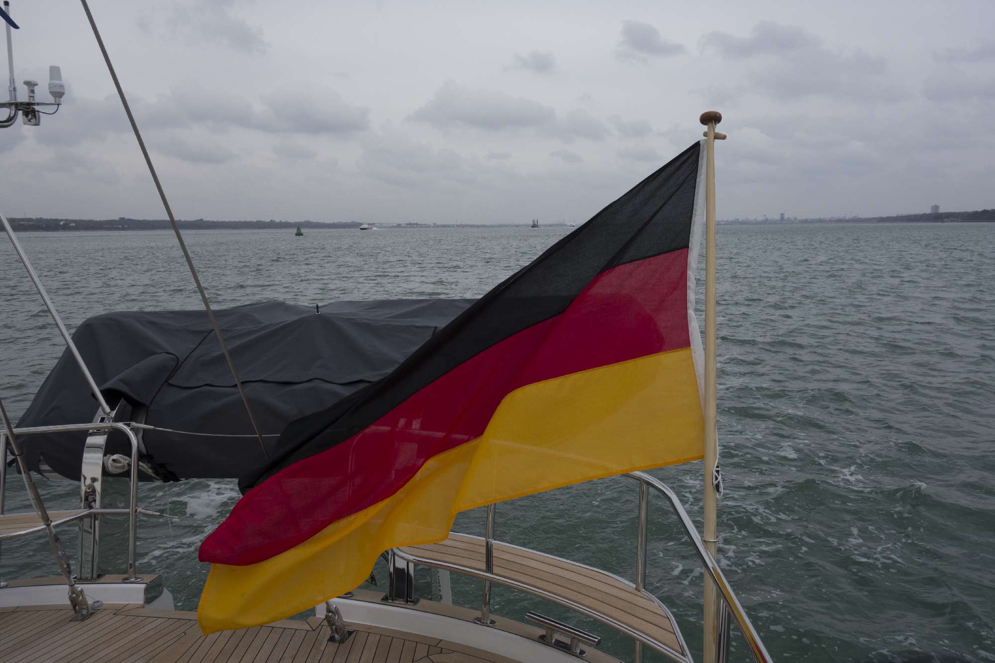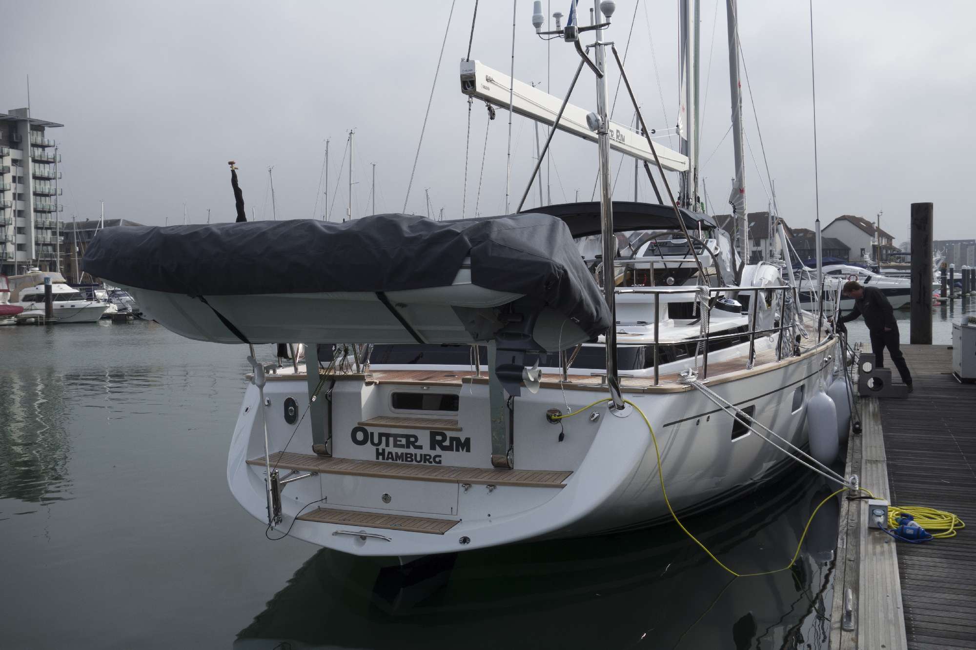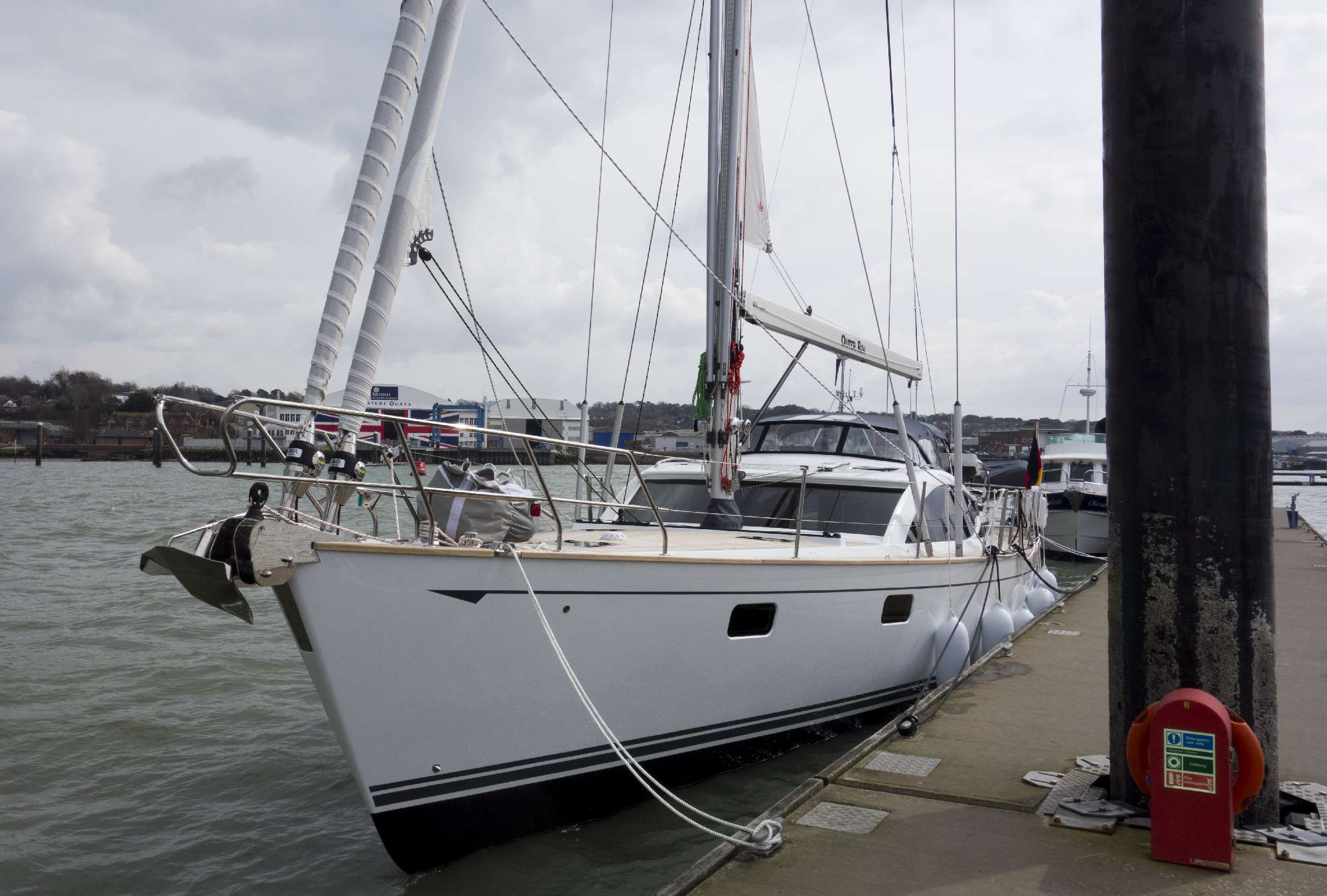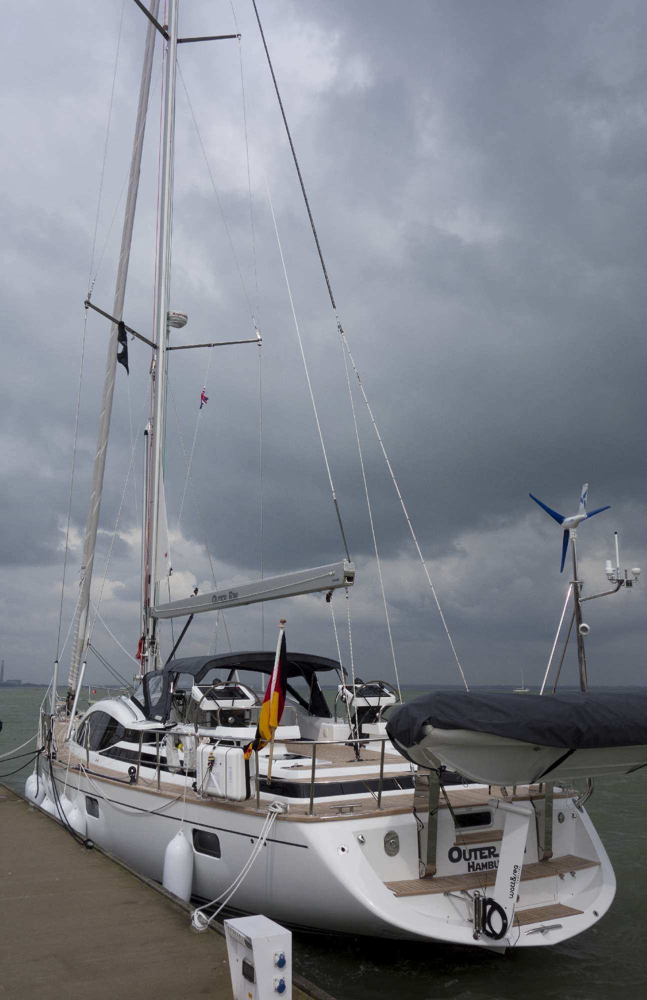 The Outer Rim finally is finished, is in the water and was handed over to us – or at least to Thomas. This week Wednesday to Friday detailed testing of the whole boat took place including a day of test sailing. It was a really great feeling to see her in the water after such a long period of waiting and to finally sail her. And she is really fun to sail! Of course, she is not a regatta yacht and 30 tons need some pushing to get up to speed. But that was known to us beforehand. But she is really smooth and easy to handle even if it gets a little rougher – as we need it as a family crusing boat. The docking manouver back in Southampton was performed without a flaw.