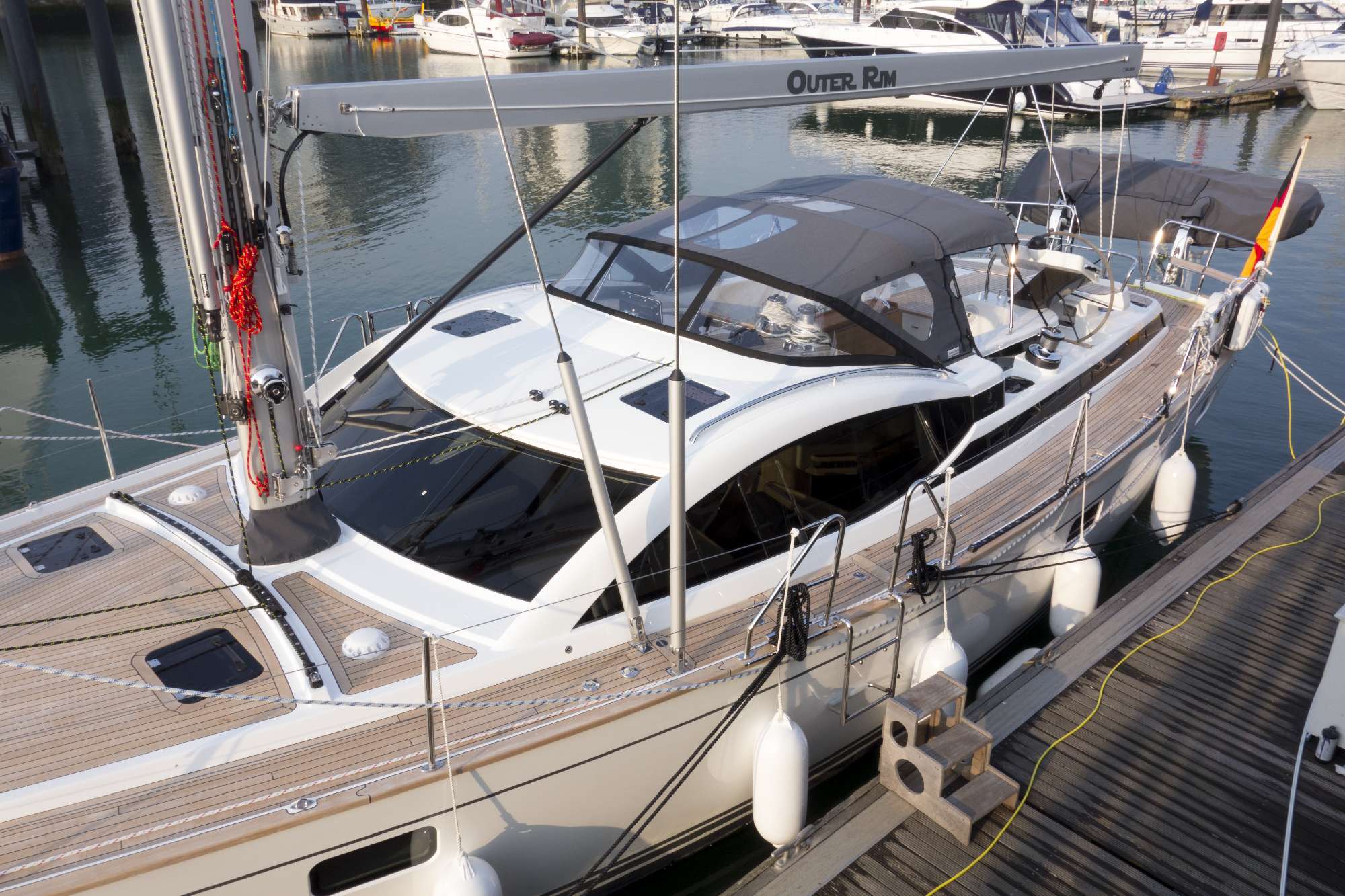 So, jetzt ist es endlich soweit: Die Outer Rim ist fertig, liegt im Wasser und wurde an uns übergeben – oder jedenfalls an Thomas. Diese Woche war Mittwoch bis Freitag ein intensives Testen des gesamten Schiffes inkl. Testsegeln. Das war schon ein schönes Gefühl, sie nach so langer Zeit unter Segel auf dem Wasser zu sehen und zu erleben. Und was kann ich sagen: Sie macht echt Spaß! Klar, das ist keine Regatta-Yacht und die 30 Tonnen müssen erst mal bewegt werden, aber das war uns ja im Vorfeld bekannt. Sie gleitet dafür absolut geschmeidigt durch das Wasser und ist sehr gutmütig am Ruder. Genau das, was wir brauchen. Das Anlegemanöver im Hafen klappte dann auch absolut reibungslos.