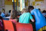 Im Klassenzimmer begrüßte uns eine nette Lehrerin selbstverständlich auf Portugiesisch. Alle Kinder hatten einen blauen Kittel an. Wir bekamen einen Platz in der letzten Reihe, neben einem netten Mädchen. Als erste Stunde hatten wir Portugiesisch. Die Lehrerin gab allen ein Blatt mit einem Text und wir mussten fehlende Wörter eintragen. Es war ganz schon schwer und unsere Banknachbarin hat uns geholfen. Ich habe gelernt, dass sol die Sonne heißt, und chuver der Regen. Anschließend ging es ohne Pause weiter. Zur Entspannung haben die Kinder ein Lied über Galina – ein Huhn – gesungen.