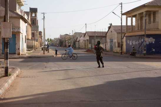Am Sonntag treffen wir die letzten Vorbereitungen für die Flussfahrt und gehen in der Freizeit zum Spielplatz. Den hat irgendeine Entwicklungshilfe hingestellt und von weitem sieht er traumhaft aus. Nur hat man dann bei der Übernahme keinen gefunden, der dafür zuständig wäre. Sämtliche Geräte sind kaputt oder beschädigt. Vsevolod fand zu seiner Freude Jungen mit einem Ball zum Fußball spielen. Andere Jungen versuchen bei uns einen neuen Ball zu erbetteln. Auf dem Spielplatz turnen nur Jungen, kein einziges Mädchen ist zu sehen. Auf dem Rückweg müssen wir durch die Militärkontrolle. die seit dem Putschversuch kurz vor Silvester die Straßen in Banjul routienemäßig kontrolliert. Jedes Auto muss anhalten. Mit den Kerlen ist nicht zu scherzen. Sie sind schwer bewaffnet und verstehen kein Spaß. Leider wollte der Mann mit Maschinengewähr nicht von vorne fotografiert werden. Am Sonntag ist auf den Straßen wenig los, wir fallen ziemlich auf. Die Kinder rufen laut Tubab, Tubab! Laufen uns nach, und irgendwann entdeckt man, dass man an jeder Hand ein dunkelhätiges Kind hat. Alle sind freundlich und auch die Gauner, die uns das verkaufen wollen, was wir nicht brauchen, sind nicht mal halb so aufdringlich wie in Dakar.