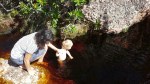 Nach einer Zeit des Laufens hörten wir das Rauschen eines kleinen Flusses. Kaum dort angekommen waren auch schon Schuhe und Kleidung der Kinder abgelegt, und alle tollten im erfrischenden Nass. Franka und Vsevolod surften die kleinen Waserfälle hinunter, Arvid und Talora wateten durch das Wasser und sammelten Steine. Alle – auch die Erwachsenen – fanden das Schwimmen unter einem der Wasserfälle als besonders entspannend. Da wir keine Badeklamotten dabei hatten, schwammen wir halt im Adamskostüm. Wir waren eh alleine.