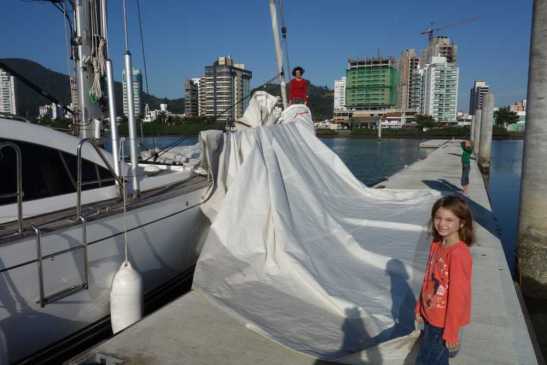 Nach einer halben Stunde war der Spuk vorbei. Der Wind beruhigte sich, kam aber immer noch von gegenan, so dass wir für eine Weile noch die Maschine laufen ließen. Preis des Abenteuers: Das Achterliek (die hintere Kante) der Genua war eingerissen. Nichts großes, aber damit ist das Segel nicht nutzbar. Also haben wir es gestern nach Florianopolis 120 km südlich von hier gefahren und reparieren lassen. Unten ein Bild von unserer Familienaktion, die 110 qm Segel geordnet abzunehmen und zu falten.