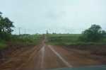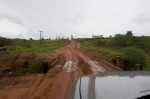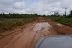 Die 62 km auf der Lehmstraße müssen wieder nach Süden gefahren werden. Als wir die ersten 20 hinter uns haben, fängt es mit dem Regen an. Es regnet gar nicht viel, es ist für tropische Verhältnisse eher ein leichter Regen, und mit Gewitterregen wie wir ihn in Asuncion erlebt haben gar nicht zu vergleichen. Aber die Straße wird dadurch trotzdem immer schlimmer. Der ganze Fahrbahn ist jetzt mit einer braunen Schmierschicht bedeckt, auf dem unser Auto kaum mehr Halt findet. Als gutes Zeichen ist zu bewerten, dass uns immer noch vereinzelt Autos entgegen kommen. Es wird aber wesentlich weniger, als auf dem Hinweg. Bei so einem Wetter will keiner freiwillig raus fahren.