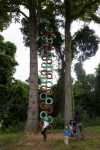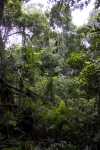 Als wir den Wald betreten sind wir vom Waldzustand positiv überrascht. Der Pfad führt durch den Dschungel, wie in einem Bilderbuch. Im höchsten Stockwerk herrschen alte Bäume mit riesigen Kronen. Ihre Stämme sind so dick, dass man sie nur zu dritt oder zu viert umarmen könnte. Überall sind Lianen und Luftwurzeln, sie kriechen den Himmel empor, hängen hinunter und lassen so gut wie kein Licht bis zum Boden durch. Eine Lianenart ist so massiv, dass sie nur auf den dicken alten Bäumen wachsen kann. Ihr Stamm ist etwa so dick wie ein Oberarm, die Blätter sind gigantisch. Natalya entdeckt in luftiger Höher eine zarte gelbe Orchidee, voll mit Blüten.