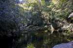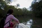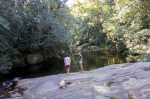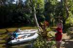 Die Auswahl der schönen Anckerbuchten bei Ihla Grande ist groß. Wir können uns lange nicht entscheiden, wohin wir von Parati aus verlegen möchten. In unserem Revierführer machen wir eine Bucht ausfindig, von der sich eine Reise mit Dinghy einen kleinen Fluß hoch zu einem Wasserfall anbietet. Zu unserer Freude kommt kurz nachdem unser Anker fällt auch die SY Robusta von Thomas und Anja und ankert direkt neben uns. Gleich wird ein gemeinsamer Ausflug geplant. Mit unserem immer noch stotternden Dinghy kämfen wir gegen Wind und Welle, dieses mal auf einer längeren Strecke. Die Bucht ist flach und wir wissen nicht genau, wo der Flusseinfahrt liegt. Der Ufer ist dicht bewachsen. Nach einigen erfolglosen Versuchen und mehrmaligem Steckenbleiben finden wir doch den Weg. Eigentlich ist er mit Strecken markiert, die uns nur als solche nicht erkannt haben. Es ist schwer zu entscheiden, ob zwischen den zwei Stecken die gewünschte Durchfahrt oder die unerwünschte Untiefe liegt.