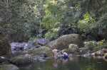 Der kleine Fluss weckt Erinnerungen an Afrika. Es ist nur weniger spannend, weil hier nicht einmal Natalya an ein plötzlich vor dem Bug des Dinghy auftauchendes Nilpferd denken kann. Der FLuss führt zu wenig Wasser und bis zum Schluss hegen wir Zweifel, ob wir den Wasserfall überhaupt erreichen können. Eine längere Strecke paddeln wir. Schließlich legen wir am Anfang eines kleinen Weges an und gehen zu Fuß weiter. Der Weg führt bergauf entlang des Wassers. Etwa nach einer Viertelstunde gelangen wir doch zu einem kleinem im Wald verstecktem Wasserfall. Die Kinder spielen im Wasser, bauen Dämme und trauen sich auch in einem kleinem Pool unterhalb des Wasserfalls zu schwimmen. Für Arvid ist das Wasser zu kalt. Auf dem Rückweg sammeln wir noch intensiv gefärbte Blätter. Unsere Großen wollen damit Wäsche färben. Das Experiment schlägt fehl, da aus den rotgrünen Blättern beim Kochen eine braune Brühe wird. Hätten wir doch auf Anja gehört und rote Beete genommen.