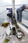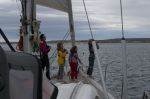 Manche Wale schwimmen ganz nah am Ufer. Aus der Ferne können wir nicht sicher sagen, ob das Orkas sind. Ein Walpärchen liegt ganz ruhig im Wasser – schwebt anscheinend bewegungslos an der Wasseroberfläche. Wir drehen daneben in den Wind, nehmen das Segel weg und beobachten still das Schauspiel. Die Tiere beginnen zu grunzen, drehen sich im Wasser um die eigene Achse, strecken die Fluke meterweit aus dem Wasser hinaus uns wedeln damit. Arvid winkt zurück und erzählt danach stundenlang, dass Wale ihm gewinkt haben.