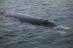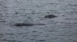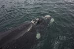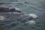 Manche Tiere kommen so nah, dass wir sehen können, wie ihre feuchte dunkle Haut glänzt. Ganz klar kann man die zwei Blaslöcher und die Struktur der großen weißen Flecken am Körper sehen. Das sind Seepocken und Walläuse, die es sich auf dem breiten Walrücken gut gehen lassen. Einer der Wale geht auf Kollisionskurs und will von den Vorfahrtsregeln für Fahrzeuge unter Segeln nichts wissen. Haarscharf kreuzt das mächtige Tier unseren Weg vor unserm Bug. Wir können den Wal aus weniger als einem Meter Entfernung beobachten. Als er an unserer Steuerbordseite knapp am Boot vorbei gleitet, schlägt er mit seiner massiven Fluke aufs Wasser, so dass Wasser in alle Richtungen spritzt.