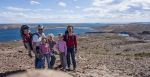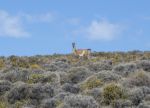 Wir arbeiten uns zügig nach oben bis zum höchsten Punkt der Gegend. Von dort aus bietet sich ein atemberaubender Panoramablick. Es ist wolkenlos. Das tiefe Blau des Ozeans mischt sich am Horizont mit dem strahlenden Blau des Himmels. In der Ferne ist der Leuchtturm des Ilha Leones zu erkennen, den wir noch am Vortag besichtigt hatten. Es ist sehr windig, die Kinder nehmen ihre T-Shirts ab und breiten sie als Segel aus und werden dabei fast weggeblasen. Nicht weit von uns entfernt entdeckt Vsevolod plötzlich ein Guanako. Das Tier bleibt stehen und beobachtet uns aufmerksam. Wir machen einen Schritt in seine Richtung, es tritt vorsichtig zwei Schritte weiter, rennt dabei aber wider Erwarten nicht gleich weg. Beim Abstieg sehen wir weitere Tiere. Auch ein Junges ist dabei.