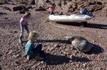 Erst am Nachmittag fahren wir an Land. Die Hauptaufgabe heißt: Guanakos zu finden. Es ist zwar Frühling hier, aber die Vegetation ist ziemlich trocken. Wir kraxeln durch die Felsen, die mit dornigen Büschen bedeckt sind, und durch die hohen und trockenen Grasbüschel. Die Guanakos haben hier schon ein hartes Leben. Nicht zu vergleichen mit einer bayerischen Alm mit ihren saftigen Wiesen. Überall sehen wir Spuren der Guanakos: Ihre Hinterlassenschaften sammeln sie meist an bestimmten Orten zu großen Haufen, die Tiere selbst aber sind scheu und daher nicht einfach zu finden. Vor allem dann nicht wenn man vier Kinder dabei hat, die vorher einige Tage keinen Ausgang hatten.