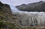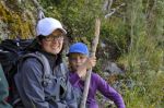 In einiger Entfernung entdecken wir die Familie von Mollymawk. Sie sind zu weit vom Ufer abgekommen und kämpfen sich zurück. Sie tragen kniehohe Gummistiefel, was für eine tolle Idee! Wir mit unseren Wanderschuhen sind hier definitiv schlechter dran. Gemeinsam geht es leichter vorwärts. Die Vorderen trampeln das Gras flach und erleichtern den Folgenden den Weg. Wir erreichen die Waldgrenze und denken, es wird bald leichter. Das Gegenteil ist der Fall. Der Wald ist noch dichter und nasser. Mollymawk will sich mit dem Anblick des Gletschersees nicht zufrieden geben, sie wollen auf den Gletscher hoch. Daher suchen wir nach einer Möglichkeit den Fluss zu überqueren. Ein umgestürzter Baum dient als Brücke.