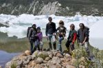 Endlich ist es so weit: wir sehen die blauen Eisspitzen des Gletschers. Der Weg ist aber noch nicht zu Ende. Nach einer kurzen Trinkpause am Ufer des Sees geht es weiter – bergauf zum Gletscherrand. In einem kleinem braunen Tümpel entdecken wir eine fast eine ausgewachsene Libellenlarve. Sie schlummert bewegungslos am Boden des Weihers und wartet darauf zu neuem Leben geboren zu werden. Die Vegetation verschwindet allmählich, bis nur die nackten Felsen, an denen sporadisch Flechten und dünnes Gras festhalten können, übrig bleiben. Geschafft! Wir stehen am Rande des Gletschers. Obwohl wir im Wald bei diesem schönen richtig sommerlichen Tag kräftig geschwitzt haben, ist es hier kalt. Jacken, Mützen, Handschuhe werden ausgepackt und angezogen.