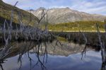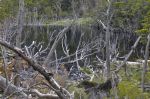 Das Nordufer des Flusses ist steiler und dicht mit Wald bedeckt. Am Südufer haben die Biber solche Schäden eingerichtet, dass der Wald auf einem ganzen Landstrich abstarb. Durch ihre Dämme und Kanäle versumpfte die Gegend so stark, dass von den Bäumen nur die toten, gegen den Himmel ragende Stämme, übrig geblieben sind. An ihre Stelle kamen stachelige Büsche mit roten Beeren, dichte Sträucher mit weißen, margaritenähnlichen Blumen und hohes Gras. Die Vegetation ist so dicht, dass Vorankommen nur im Gras direkt am Ufer möglich ist. An manchen Stellen erleichtern Tierpfade das Gehen. Aber auch sie schützen nicht vor Versinken in tiefen Schlammlöchern. Um ihr Holz zu schippern bauen die Biber viele schmale Kanäle. Nachdem sie nicht mehr benutzt werden, verdeckt das Gras diese Gräben. Wer nicht jede Sekunde aufpasst, steckt schnell mit einem Fuß tief im Schlamm.