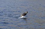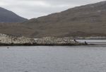 Wo die Seelöwen etwas zu futtern finden, dort suchen auch die Fischer. Auf einem kurzen Abschnitt treffen wir gleich drei kleine Fischerboote – die ersten seit Wochen. Während wir uns der Peninsula Brecknock nähern, strotzt das Wasser vor Leben. Unzählige tellergroße Quallen ziehen am Boot vorbei. In der Ferne entdecken wir einen Blass, und gleich danach die charakteristische Finne eines Buckelwals. Seebären springen in großen Gruppen um uns herum, und vollführen akrobatische Kunststücke, machen Saltos in der Luft. Sie sind um einiges kleiner als die Seelöwen und dadurch viel flinker und wendiger. Vereinzelt tauchen hier und dort Pinguine auf.