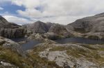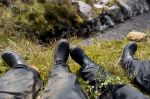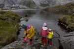 Am nächsten Tag lacht die Sonne schon zum Frühstück und wir steigen alle zusammen auf einen kleinen Hügel an unserer Bucht. Dahinter versteckt liegt ein kleiner See. Die Kinder waten durch das Wasser und testen ihre Gummistiefel. Franka hat schon beim Anlanden nasse Füße bekommen, darum kann sie jetzt auch ungestört prüfen, ob ihre Stiefel auch von innen wasserdicht sind. Nach dem Test beschäftigt sie sich mit der Verschönerung des Ufers und schmückt einen besonders hübschen Mooshügel mit Edelweißen und Margariten. Die Erwachsenen liegen einfach nur im weichen Moos und genießen die warmen Sonnenstrahlen auf dem Gesicht. Leider endet der Ausflug zu früh, da Arvid dringend eine frische Hose braucht.