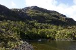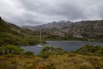 Die ganze Nacht heult es draußen wie wild. Erst gegen Morgen bessert sich das Wetter und es kommen nur einzelne Williwaws herunter. Sie sind auch nicht mehr so stark wie vorher. Am Nachmittag steigt Thomas auf den Berg, um einen Wetterbericht abrufen zu können. Er muss gleich zwei Mal die beschwerliche Strecke durch die dichte Vegetation und über die steilen Hänge zurücklegen, da eines der Kinder ein Kabel aus dem Telefon herausgezogen hat. Das zweite Mal geht Vsevolod auch mit und ist von der Wanderung restlos begeistert. Von oben kann man einen großen See beobachten, der hinter der Felskante direkt hinter uns liegt.