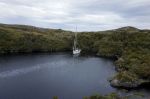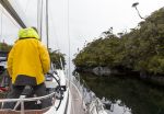 Obwohl der Leuchtturmwächter einen für uns günstigen Südwest-Wind am Eingang der Magellanstaße meldet, bleibt es bei uns den ganzen Tag windstill. Die Outer Rim gleitet unter Motor durch das spiegelglatte Wasser des Canal Smyths. Was für ein Unterschied zur tosenden Magellanstaße. Hier gibt es so viele Inseln und Engstellen auf dem Weg, dass sich selbst bei Wind kaum Welle aufbauen könnte. Leider regnet es fast die ganze Fahrt.