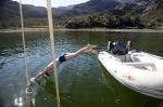 Zurück auf dem Boot – ist Baden angesagt. Das Bord-Thermometer zeigt knapp 20°C Wassertemperatur. Wir sind uns nicht sicher, ob das auch stimmt – die Referenzmessung mit einem Hand-Thermometer steht noch aus. Franka und Vsevolod suchen hektisch ihre Badesachen und finden nichts. Sie sind in der untersten Bilge, wer hätte ja gedacht, dass man hier schwimmen könnte … Die Badeleiter ist ähnlich tief vergraben worden. Aber es geht auch ohne. Sie springen ins Wasser und haben viel Spaß dabei. Arvid fordert sofort eine Pütz voll Wasser ein, um Füße zu baden. Es herrscht das Gefühl von Hochsommer. Zum ersten Mal seit Wochen können wir im Cockpit Abendessen. Alle Fenster sind breit geöffnet.