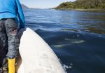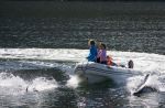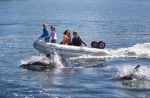 Während das Schlauchboot von John und Penny uns annähert, tanzt Natalya ungeduldig auf der Badeplattform, um zu den Delfinen hinein zu springen. Unser Wasserthermometer zeigt wieder fast 20 Grad Celsius. Die Delfine sind da, sie springt rein, und das erste was sie spürt ist fast ein Kälteschock. Das Thermometer spinnt! Ein wenig verkrampft wegen der unerwartet starken Abkühlung, schwimmt Natalya neben dem Boot, die neugierigen Tiere halten sich in der Nähe auf. John gibt den Tipp, etwas unter Wasser zu tauchen. Das kostet zwar große Überwindung auch den Kopf ins kalte Wasser zu stecken! Aber als es tatsächlich geschafft ist, kommen einige Delfine sofort näher und tauchen direkt unter Natalya durch. Sie sieht ihre weiße Streifen unter sich vorbei flitzen. Die Tiere springen vor Freude aus dem Wasser und kreisen immer wieder um Natalya herum. Ein unvergessliches Erlebnis!