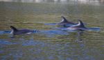 Thomas und die Kinder starten den Motor (ja, er funktioniert wieder!) und fahren zur Aramia, die bedingt durch die lange Suche, gar nicht so nah liegt, wie man sich für ein gemeinsames Lunch wünschen würde. Kaum beginnt der Motor zu arbeiten, tauchen im Fahrwasser des Dinghys einige Delfine auf. Die verspielten Tiere jagen dem Schlauchboot hinterher und bringen unsere Kinder zum lauten Johlen. Nur hinterher schwimmen ist langweilig, daher tauchen die Tiere unter dem Dinghy durch, kommen plötzlich ganz knapp neben dem Boot auf der anderen Seite auf, bringen eine Wasserfontäne mit sich und spritzen alle Bootsinsassen nass. Die Kinder bekommen gar nicht genug davon und rufen nach einer Zugabe. Thomas fährt im Slalom scharfe Kurven, was den Tieren und den Kindern noch mehr Spaß bereitet. Die Delfine springen vor Freude aus dem Wasser. Kaum steht das Dinghy schwimmen die Delfine ungeduldig dicht unter dem Boot, kommen bis auf Armeslänge heran und warten, bis dass Fangen-Spielen weiter geht. Als wir von der Aramia zurück kommen, wiederholt sich das ganze Spektakel. Die Delfine scheinen nur darauf zu warten, dass ein schneller Spielgefährte kommt und sie ein wenig unterhält.