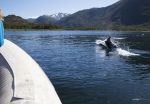 Unsere Freunde von der SY Aramia haben wir nun seit über fünf Wochen nicht mehr gesehen, wissen aber, dass sie sich auf dem Rückweg von Puerto Natales befinden müssten. Auf gut Glück ruft Natalya auf Kanal 16 nach Aramia. Zu ihrer großer Überraschung kommt sofort eine Antwort von John. Sie befinden sich tatsächlich auf dem Weg zurück in den Canal Smyth und sind nur eine Stunde von Puerto Fontaine entfernt. Wir verabreden uns für ein gemeinsames Lunch in der Bucht. Als wir ankommen, lässt Aramia gerade ihren Anker fallen. Wir suchen auch einen Platz, was sich gar nicht so einfach gestaltet. Die Bucht ist sehr tief, in 30 Meter Tiefe wollen wir nicht ankern. Endlich findet Thomas eine weniger tiefe Stelle, das Dinghy wird heruntergelassen. Einige Peale Delfine beobachten das Geschehen aus sicherer Entfernung.