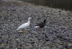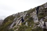 Alle gemeinsam unternehmen wir einen kleinen Ausflug und erklettern den relativ steilen Hang am östlichen Ende des Strandes, um Überblick über die Gegend zu gewinnen. Arvid ist begeistert von Größe der wild brausenden Wasserfälle, die wir erreichen, und würde sehr gerne bis zu den Schneefeldern weiter oben kommen. Leider ist das mit der Kraxe nicht möglich, zu weit der Weg und zu unwegsam das Gelände. Mit großer Vorsicht steigen wir wieder ab. Der starke Wind wirft uns Regentropfen ins Gesicht, der Boden ist nass und glitschig. Wieder unten angekommen bleiben die Kinder am Stand spielen. Wind und Regen machen ihnen nichts aus.