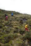 Eine größere Gruppe Kondore kreist neugierig über unseren Köpfen. Die bleiben so lange und so nah bei uns, dass wir unwillkürlich an den Film „Die Vögel“ von Hitchcock denken. Manchmal kommen wir an steilen Kanten an und müssen wieder zurück laufen, um eine Alternative zu suchen. Wir kämpfen uns durch das Gestrüpp der kleinen Wäldchen, die sich in den relativ windgeschützten kleinen Tälern angesiedelt haben. Dummerweise sind das genau die Stellen, die sich zum Hochsteigen am besten eignen.