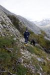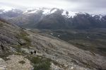 Um den Weg zu verkürzen probieren wir kurz den Gletscherfluss hoch zu fahren, aber er ist so milchig trüb, dass wir weder die Tiefe noch die Hindernisse erahnen können. Das Boot wird an Land gezogen. Wir müssen doch die ganze Strecke selber laufen. Das Tal des Gletscherflusses ist so nass und so dicht bewachsen, dass wir sofort die Idee des unteren relativ flachen Weges verwerfen. Wir steigen an einem terrassenförmigen Berghang langsam hoch. Es geht ständig rauf, runter, flach. Wir überqueren unzählige Bäche, wandern um kleine Baumgruppen herum, suchen uns Wege um kleine Seen.