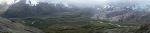 Den ganzen Weg haben wir einen riesigen Gletscher vor Augen. Obwohl der Himmel fast vollständig bedeckt ist, ist die Sicht gestochen scharf. Die Sonne spielt mit uns Verstecken und beleuchtet mal hier mal da einen Fleck. Der Kontrast der tiefen, fast schwarzen Wolken und des weißen, durch Sonnenstrahlen grell beleuchteten Schnees verschafft einen zusätzlichen Reiz. Als wir schon einige Höhenmeter hinter uns haben, können wir fast den gesamten Gletscherfluss überblicken. Schlangenlinien des unglaublich intensiv gefärbten Flusses ziehen durch ein breites Tal. Die Farbe ist mit Worten kaum zu beschreiben. Das Wort „türkis“ würde am besten passen, aber das ist nicht intensiv genug, um die Schönheit und die Intensität dieser Farbe zu vermitteln.