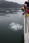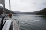 Schon lange bevor wir überhaupt die Gletscherzunge sehen können, kommen uns die ersten Eisschollen entgegen. Es werden schnell mehr und immer mehr. Natalya hält am Bug Eiswache und hilft Thomas, freies Wasser zu finden, was mit der Zeit immer schwieriger wird. Wir biegen um die Ecke in den Estero Asia – immer noch keine Sicht auf die Gletscherzunge – und kriechen langsam voran. Ringsherum ist Eis, wir können uns nur sehr langsam und umsichtig bewegen. Trotzdem kratzt und kracht es immer wieder am Rumpf. Pealedelfine kommen und begleiten uns ein Stück des Weges. Im Gegensatz zu uns haben sie mit Eis nicht die geringsten Probleme. Eine größere Eisscholle stößt die Outer Rim von Steuerbord. Irgendwann schreit Natalya vom Bug: „Ich weiß nicht mehr wohin!“ Rundherum ist nur Eis, und die Gletscherwand ist noch nicht mal in Sicht. Dafür haben wir einen phantastischen freien Blick in den Estero Peel und auf seine mächtigen Schneeberge im Norden. Wir schalten den Motor aus und genießen den Augenblick. Wir lassen uns mit der Strömung und den Eisstücken treiben. Die Kinder finden eine wichtige Aufgabe: Mit dem Bootshaken dirigieren sie die um uns treibenden Eisschollen und stoßen sie von der Outer Rim weg.