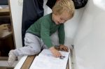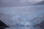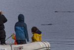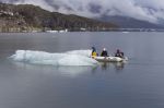 Wir werfen Anker unmittelbar vor der Gletscherwand und lassen das Dinghy herunter. Wie durch ein Wunder reißt just in diesem Moment der Himmel auf und lässt das Blau des Gletschers erstrahlen. Natalya und die Kinder paddeln raus und schauen sich das schwimmende Eis genauer an. Ein Otter schwimmt an Dinghy vorbei und lässt sich durch den Krach der Kinder nicht verunsichern. Wir rudern durch ein relativ lockeres Eisfeld an Land und klettern auf die Felsen. Runde, mit Moos bewachsene Granitbrocken bieten nicht wirklich guten Halt. Arvid ist das egal, er will die Pfützen ausmessen, und rennt Hals über Kopf von einer zur anderen. In der nächsten versinkt er bis zur Hüfte. Obwohl Natalya ihn ziemlich schnell wieder herauszieht, läuft ihm das Wasser von oben in die Regenhose.
