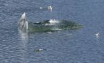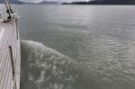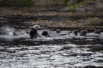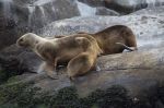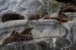 Aus dem Seno Iceberg biegen wir nach Norden in den Canal Messier. Die Bedingungen dort sind ausgezeichnet, kaum Wind und keine Welle. Wir kommen damit gut voran und peilen die Caleta Point Lay als Ziel an. Kurz davor entdeckt Natalya mit dem Fernglas komische orangbraune Mooshügeln auf dem Felsen. Bei näherer Betrachtung verwandeln sie sich in eine große Seelöwenkolonie. Wir steuern sie direkt an und können die Tiere aus unmittelbarer Nähe beobachten. Viele Junge sind dabei. Arivd ist begeistert. Als wir den Tieren ihrer Meinung nach zu nah kommen, ergreifen sie die Flucht. Die Bullen steigen und rennen dabei rücksichtslos über die eigenen Kindern und landen als Erste im Wasser. Die Weibchen sind gelassener. Zwei Jungtiere bleiben unbeeindruckt auf dem Fels sitzen: "Warum sollten wir ins kalte Wasser springen!?" Jetzt ist auch der Skipper (am Bug stehend) der Meinung, dass wir dem Felsen zu nah gekommen sind. Kelpbüschel tauchen direkt vor unserem Bug auf. Kamera weg legen, zum Steuerstand laufen und schnell volle Kraft zurück! Aus einiger Entfernung sehen wir dann, dass sich die Gruppe schon gemütlich auf der anderen Seite der Felsen hingelegt hat. Die letzten Tiere kriechen gerade aus dem Wasser.