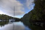 Kurz vor Einbruch der Dunkelheit erreichen wir unsere Ankerbucht. Die Einfahrt ist schmal und liegt lt. Revierführer zwischen zwei Felsen. Den ersten erkennen wir bald, der zweite ist unter Wasser und lässt sich nicht blicken. Das Wasser des Fjords ist so gut wie schwarz und undurchsichtig. Thomas tastet sich vorsichtig an dem sichtbaren Felsen vorbei. Natalya hält am Bug nach weiteren Hindernissen Ausschau. Als die Routinearbeite mit Landleinen erledigt ist, sind wir froh Feierabend zu haben. Es ist doch ein langer ereignisreicher Tag geworden und die Sonne geht bald unter.