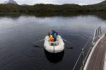 Thomas und die Jungs setzen das Dinghy ins Wasser und fahren los, um unseren Wasservorrat aufzufüllen. Ein kleiner Wasserfall fällt unweit des Ankerplatzes vom steilen Fels ins Wasser. Man muss die vollen Kanister gar nicht ins Dinghy hieven, sondern kann sie mit einem Schlauch gleicht im Boot auffüllen. Nachdem die Arbeit erledigt ist, hört es endlich auf zu regnen. Die Wolken brechen auf, und die Sonne kommt heraus. Wir folgen dem Rauschen des Wassers und den Schaumspuren, und erkunden einen kleinen reißenden Fluss. Weit kommen wir nicht, da eine Stromschnelle im Weg ist.