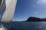 Schließlich ist es so weit. Der Anker wird hoch geholt. Wir passieren die enge Einfahrt und setzen die Segel. Mit leichtem Wind dümpelt die Outer Rim mit 3 Knoten durchs Wasser. Aber wir haben es heute ausnahmsweise nicht eilig. Der Tag ist strahlend blau, die Sicht ist perfekt. Vor uns sehen wir die Insel San Pedro, mit einem gestreiften Leuchtturm darauf. Hinter uns erstrahlen die weißen Gipfeln des nördlichen Teils des patagonischen Eisfeldes. Der Schwell ist ganz leicht, unter einem Meter. Wie genießen die ersten zehn Meilen. Wir hätten nichts dagegen, dass die Fahrt weiterhin so entspannt bleibt. Nur das ist zu schön, um wahr zu sein, das ist uns doch bewusst.