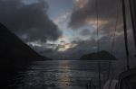 Leider ist der Wind so weit abgeflaut, dass wir anfangs kaum Fahrt machen. Die Outer Rim schaukelt ziemlich heftig ohne ordentliche Anströmung der Segel im mächtigen Schwell. Zum Glück ist das nur vorübergehend – als wir den Windschatten der letzten Insel verlassen, ist der Wind wieder da. Der kommt von achtern, daher wird für die Nacht die Genua ausgebaumt. Dabei ist für einige Zeit das Schiff komplett den Wellen ausgesetzt, da die Segel vollständig eingerollt werden müssen. Entsprechend heftig ist die Bootsbewegung. Natalya hält mit einer Hand die Leinen, mit der anderen krallt sie sich an der Reling fest. Das Deck hüpft auf den Wellen drauf und drunter, das Boot schlingert von einer Seite zur anderen.