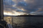 Wir fahren wieder zurück zur Outer Rim. Nach dem Abendessen soll es weiter gehen. Wir berechnen die Zeit so, dass wir wieder die Nacht durchsegeln und am frühen Morgen bei den ersten Sonnenstrahlen bei unserem Ziel ankommen. Im Zwielicht der Dämmerung verlassen wir die schützende Bucht. Natalya ist schon dabei die Kinder fürs Bettgehen vorzubereiten als sie heftiges Klopfen an den Fensterscheiben hört. Panisch schaut sie heraus: "ist was mit dem Boot?" Nein, mit dem Boot ist alles bestens, Thomas trommelt alle zusammen, um Wale zu beobachten. Im lautem Abendtrubel an Bord hat keiner seine vorangegangenen dezenteren Rufe gehört.