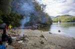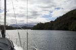 Sanfte hügelige Landschaften ziehen an uns vorbei. Einige wenige Meilen dürfen wir sogar den Motor abstellen und auf dem ruhigen Wasser lautlos dahingleiten. Man hört die Wasserfälle, die irgendwo im Wald verborgen tosend herunterstürzen und Papageien, die sich bei unserer Annäherung laut aufregen. Die letzten Meilen passt der Wind dann auch noch zum Segeln. Wir biegen in den Canal Chacabuco ein und werden von 3-4 Knoten Strömung erfasst. Das Wasser sprudelt und kocht – schön anzusehen. Im Canal werden wir ordentlich nach Osten geschoben, genau dahin wollen wir ja auch. Da macht es nichts, dass wir kaum noch Wind haben und mit 1-2 Knoten durchs Wasser dümpeln. Bis zum Eingang der Caleta Jacqueline bleibt das Segel oben.