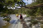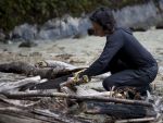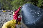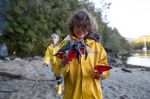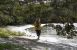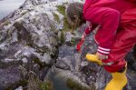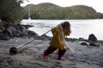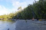 Während Thomas und die Kinder zum Strand fahren, genießt Natalya alleine die Ruhe am Bord. Später sammeln wir alle gemeinsam Treibholz für ein Lagerfeuer am Abend. Plötzlich ruft Franka: "Mama, schau, da ist eine Katze!" Hm, eine Katze hier am Wasser? Sind sie normalerweise nicht wasserscheu? Bei näherer Betrachtung stellt sich heraus, dass das Tier eher wie ein Wiesel aussieht, glänzendes dunkelbraunes Fell hat, und einen Schwanz, der fast genauso lang ist wie das Tier selbst. Es hat keine Angst vor Menschen, kommt ganz nah an uns heran. Die Kinder können ihm auf Schritt und Tritt folgen, und beobachten, wie es auf den von der Tide freigelegten Felsen Schnecken jagt und sie für schlechtere Zeiten am Ufer vergräbt. Im keinem unserer Bestimmungsbücher können wir das Tier finden. Eigentlich sieht es wie ein nordamerikanischer Nerz aus, aber wie käme der denn hierher? Sein Pelz sieht hochwertig aus. Ist es ein Flüchtling aus einer Pelzzuchtstation? Wahrscheinlich nicht.