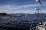 So fahren wir am späten Nachmittag in das Estero Atracadero (was romantisch klingt heißt übersetzt „Schiffsanlegestelle“). Schiffe sind weit und breit keine zu sehen. Dafür machen wir bei der Einfahrt in den Fjord unsere erste Bekanntschaft mit einer Fischzuchtstation (Salmonera). Sie versperrt die ohnehin schon mehr oder weniger schmale Einfahrt. Dabei hängen um das eigentliche Fischzuchtbecken herum einige Mooringbojen in ordentlichen Größe, von denen noch Leinen im Wasser hängen und sich wie Fangarme in unsere Richtung ausstrecken. Langsam tasten wir uns vorbei. Auf dem Weg werden wir von einem Fischer in einem kleinen Bötchen freundlich begrüßt. Die Bucht bietet genug Platz um frei zu ankern. Die Kinder beschweren sich, dass die Bucht nicht komplett wild ist und Anzeichen von Besiedelung zeigt. Daran werden wir uns ab jetzt gewöhnen müssen.