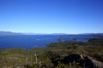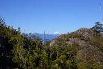 Nachdem Erklimmen der ersten Höhenstufe setzt sich Vsevolod hin und entscheidet, dass er lieber hier auf uns wartet. Natalya und Thomas gehen weiter. Dabei ist Thomas der Einzige, der den eigentlichen, aus fast senkrecht abfallenden Granitbrocken bestehenden Gipfeln, erreicht. Natalya setzt sich im Windschatten hin und genießt den Blick auf den schneebedeckten Vulkankegel des Volcan Macá am gegenüberliegenden Ufer und die im Canal Moraleda verstreuten unzähligen großen und kleinen Insel. Ein wenig weiter südlich, mitten im Kanal sind die Häuser von Puerto Aguierre zu erkennen.